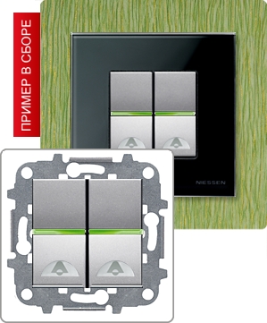 Кнопка звонка двухклавишная с символом Звонок (2н.о.) с зеленой подсветкой, ABB Zenit, на клеммах, серебро
