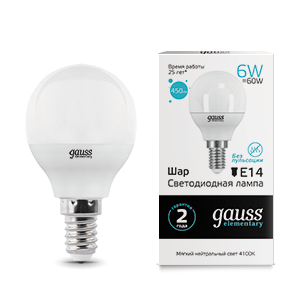 Лампа светодиодная Gauss Elementary Шар 6W 450lm 4100K E14 LED 220V