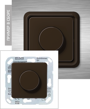Светорегулятор поворотно-нажимной Jung CD для ламп накаливания 230в и обмоточных трансформаторов 12в, без нейтрали, коричневый
